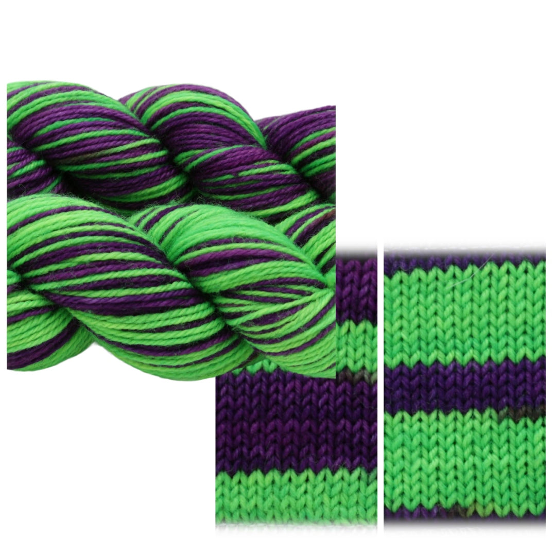 Datura metel is an Isomer colorway.  When you order an Isomer colorway, you will get 2 50g skeins of self striping yarn that coordinate, but DO NOT MATCH.  All the colors in each skein will be repeated, but will stripe in a different order or width on each half.